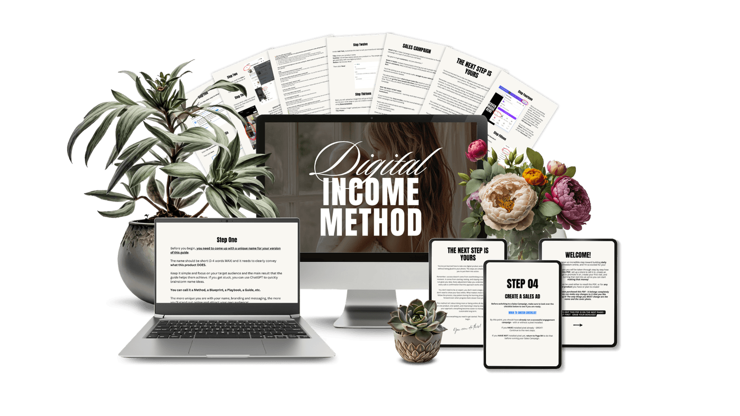Digital Income Method is a step-by-step PDF for women ready to leave the 9–5 and build passive income online around their kids, without showing up on camera, becoming tech experts, or needing a huge social following.